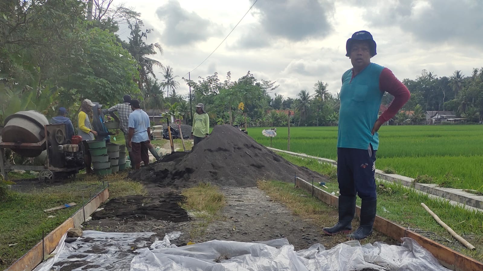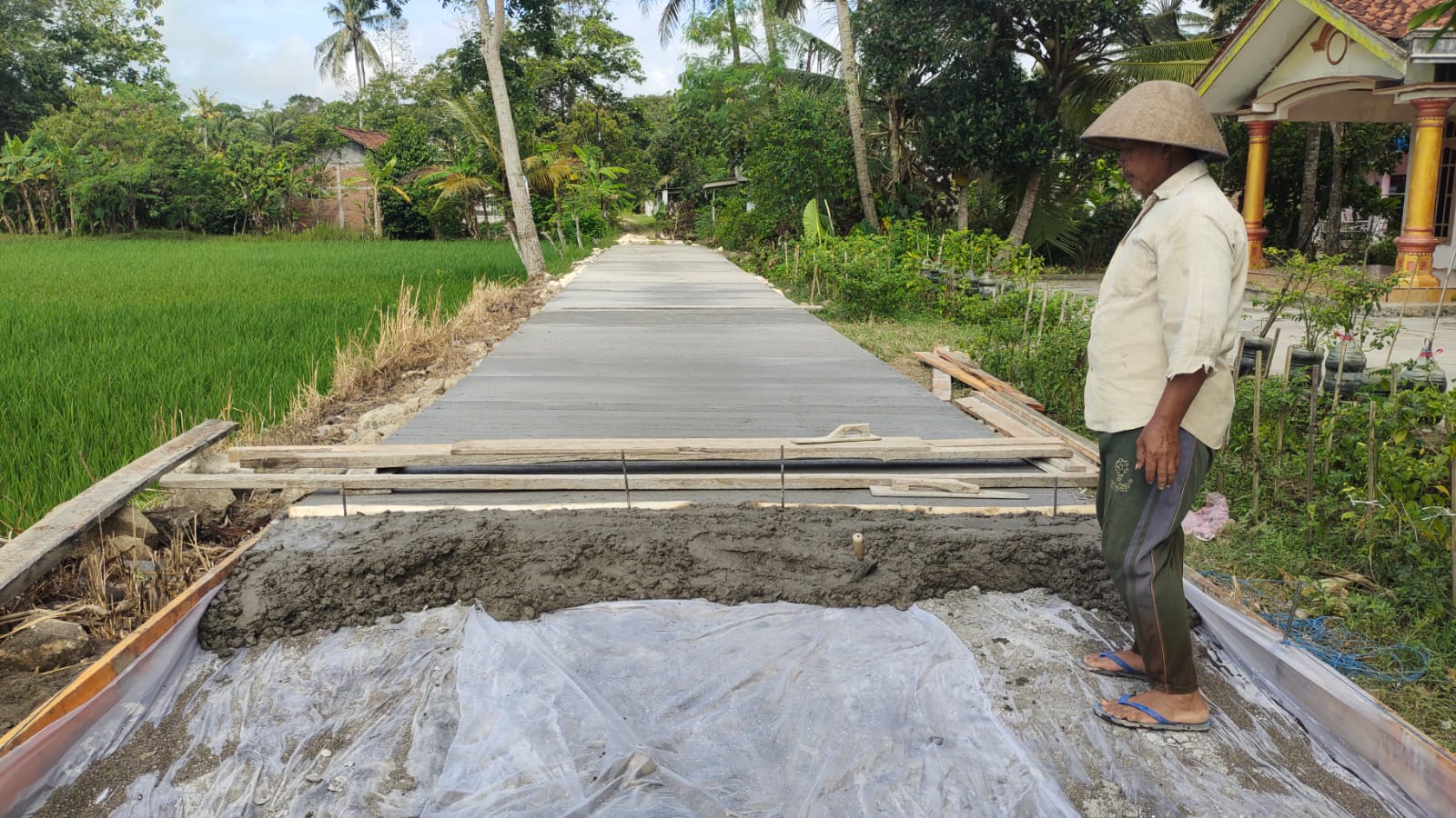 Adapun volume pekerjaan pembangunan jalan rabat beton ini meliputi panjang 96 meter, lebar 3 meter, dan tebal 0,15 meter. Spesifikasi tersebut dirancang untuk menghasilkan konstruksi jalan yang kuat, tahan lama, serta mampu menunjang beban aktivitas masyarakat dalam jangka panjang.