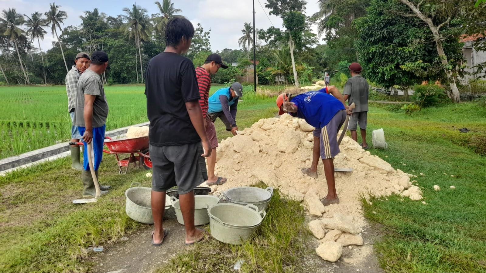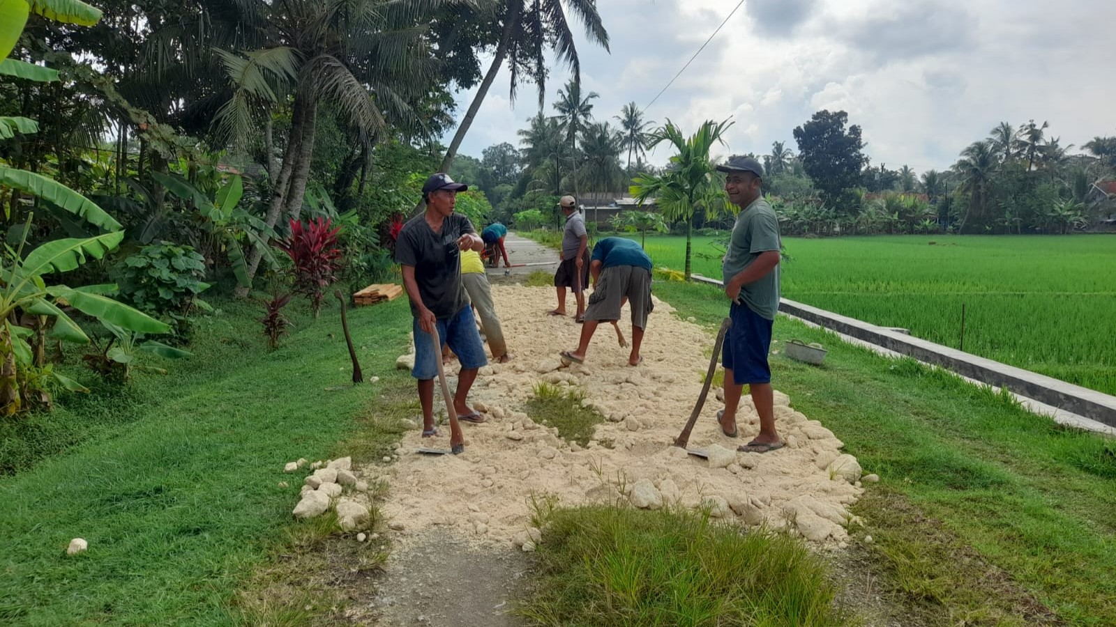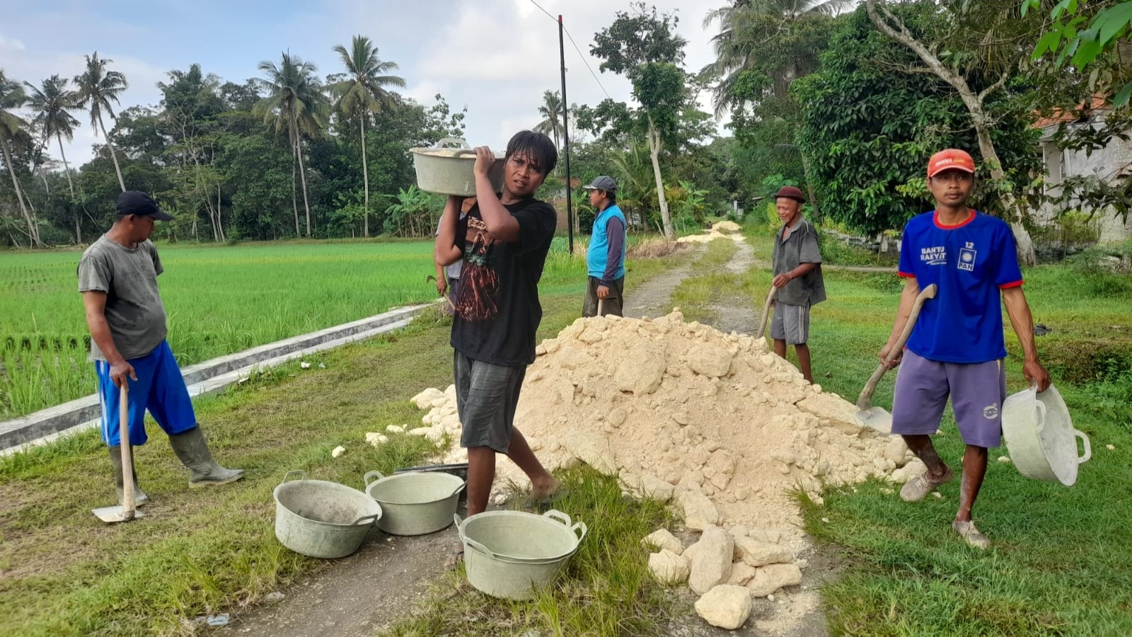 Di lokasi terlihat warga bekerja bergotong royong meratakan material urugan menggunakan cangkul, sekop, dan alat sederhana lainnya. Tumpukan material urug yang diturunkan di beberapa titik jalan kemudian diratakan sebagai dasar pondasi sebelum tahap pemadatan dan pengecoran beton dilakukan. Suasana kerja penuh kebersamaan tampak jelas, mencerminkan semangat gotong royong masyarakat Dusun Warureja.