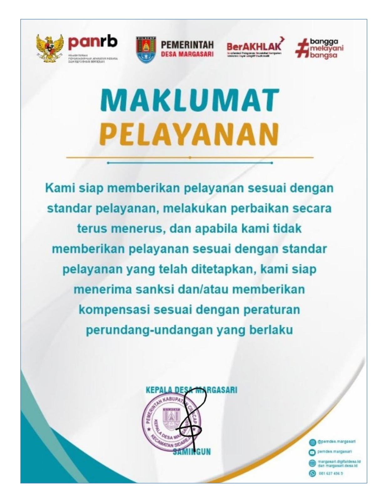 Melalui Maklumat Pelayanan ini, Pemerintah Desa Margasari menyatakan kesanggupan untuk: